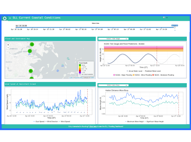 Our Current Coastal Conditions Dashboard allows you to explore live data from monitoring equipment across Boston Harbor and coastal Massachusetts. This dashboard provides data on wind speed, wave height, and water levels in addition to flooding.