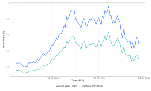 Waves started building overnight and into the early morning hours of February 23. Peak wave heights occurred at 5:20 am and 2:40 pm, with maximum wave heights reaching 11.5 ft and 12.1 ft, respectively, on February 23.